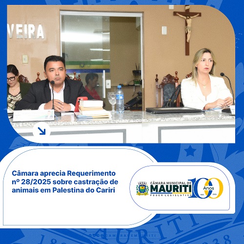 Na última sessão da Câmara Municipal de Mauriti, foi apresentado o Requerimento nº 28/2025, de autoria do vereador Teófilo Joaquim do Nascimento (PT). O documento solicita o envio de ofício ao Centro de Zoonoses do município, requerendo a realização, em caráter de urgência, de uma ação de castração dos animais em situação de rua no distrito de Palestina do Cariri.