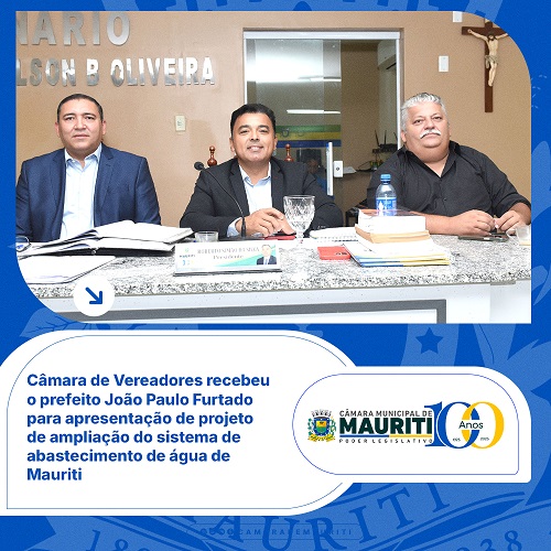 Na sessão realizada nesta semana, a Câmara Municipal de Mauriti recebeu a visita do prefeito João Paulo Furtado, que foi convidado para discorrer sobre o projeto de ampliação do sistema de abastecimento de água da sede do município.