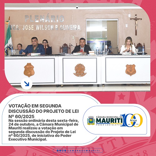 Na sessão ordinária desta sexta-feira, 24 de outubro, a Câmara Municipal de Mauriti realizou a votação em segunda discussão do Projeto de Lei nº 60/2025, de iniciativa do Poder Executivo Municipal.