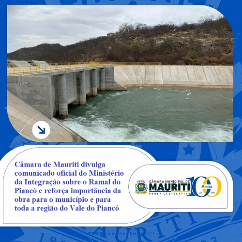 A Câmara Municipal de Mauriti informa à população que recebeu, por meio do Ofício nº 941/2025, um comunicado oficial do Ministério da Integração e do Desenvolvimento Regional (MIDR) referente ao avanço do processo de Licenciamento Ambiental do Ramal do Piancó, obra estratégica que terá implantação no município e que beneficiará diretamente comunidades de Mauriti e todo o Vale do Piancó, na Paraíba.