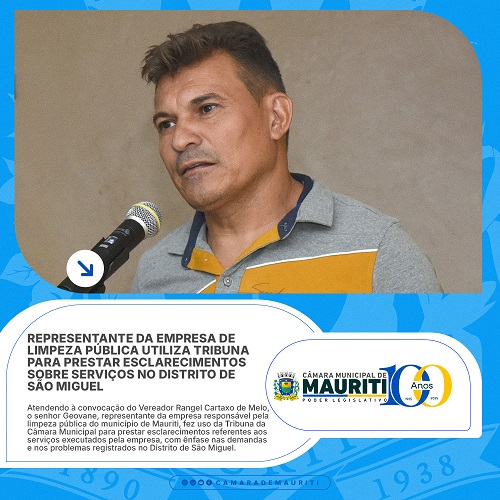 Atendendo à convocação do Vereador Rangel Cartaxo de Melo, o senhor Geovane, representante da empresa responsável pela limpeza pública do município de Mauriti, fez uso da Tribuna da Câmara Municipal para prestar esclarecimentos referentes aos serviços executados pela empresa, com ênfase nas demandas e nos problemas registrados no Distrito de São Miguel.