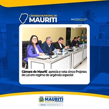 Durante sessão ordinária, a Câmara Municipal de Mauriti realizou a votação em única discussão dos Projetos de Lei nº 09, 10, 11, 12 e 13 de 2026. As matérias foram apreciadas em caráter de urgência especial, após aprovação do plenário na sessão ordinária anterior.