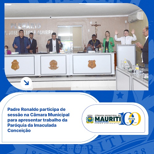 Atendendo ao requerimento apresentado pelo vereador Horaciano Praça Dionízio Montenegro, a Câmara Municipal de Mauriti recebeu, nesta semana, a presença do reverendíssimo Padre Ronaldo. O sacerdote foi convidado a fazer uma explanação sobre as ações e projetos desenvolvidos à frente da Paróquia da Imaculada Conceição.